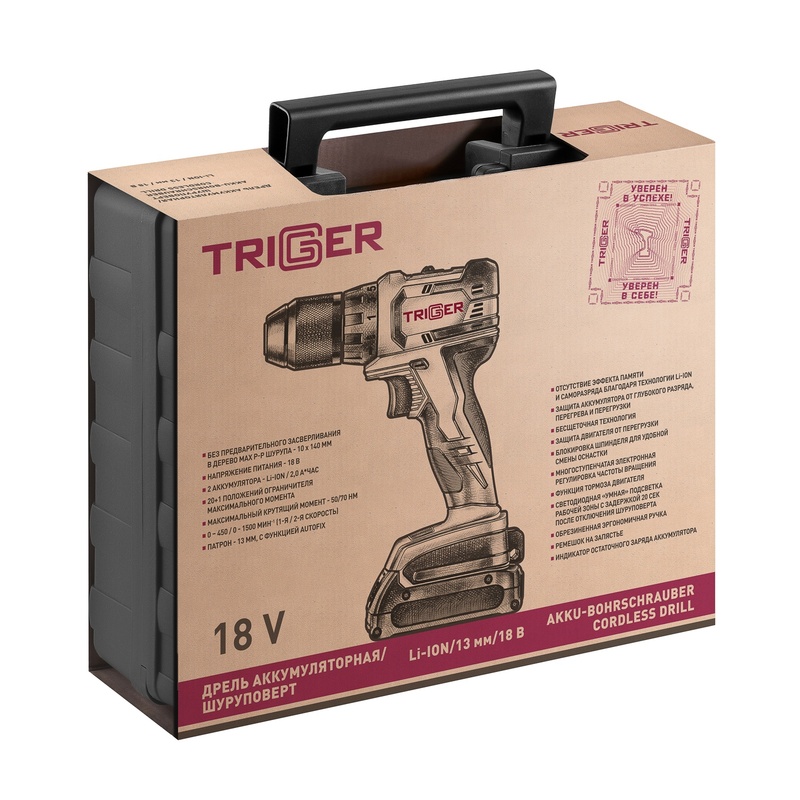 Дрель-шуруповерт Trigger 20111, бесщеточная, 2 аккумулятора Li-ion (2Ач), 18V, 13 мм, 72 Нм, кейс в Сочи