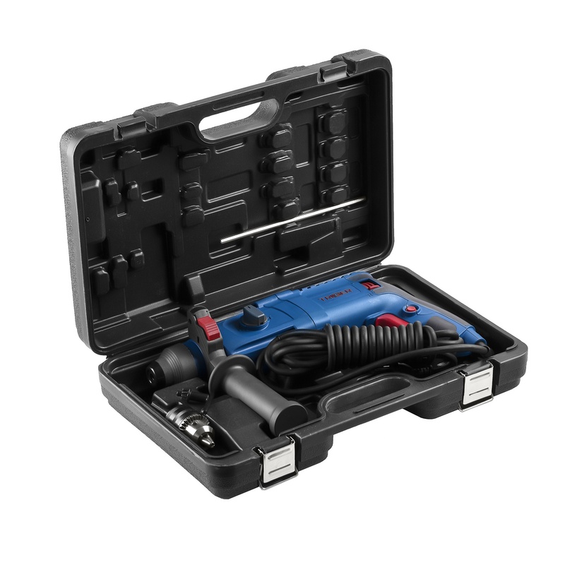 - В комплекте: переходник SDS+, цилиндрический патрон с ключом, дополнительная рукоятка, ограничитель глубины сверления, запасные щетки, пластмассовый кейс.