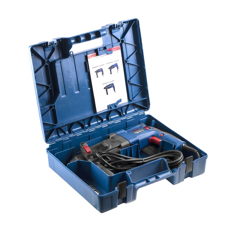 • В комплекте: переходник SDS+, цилиндрический патрон с ключом, дополнительная рукоятка, ограничитель глубины сверления, запасные щетки, пластмассовый кейс.